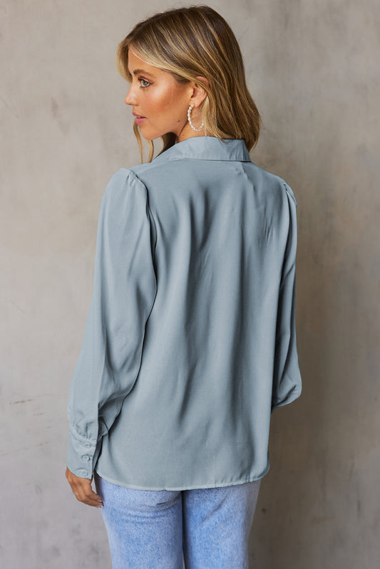 Sky Blue Solid Color Button Up Puff Sleeve Blouse