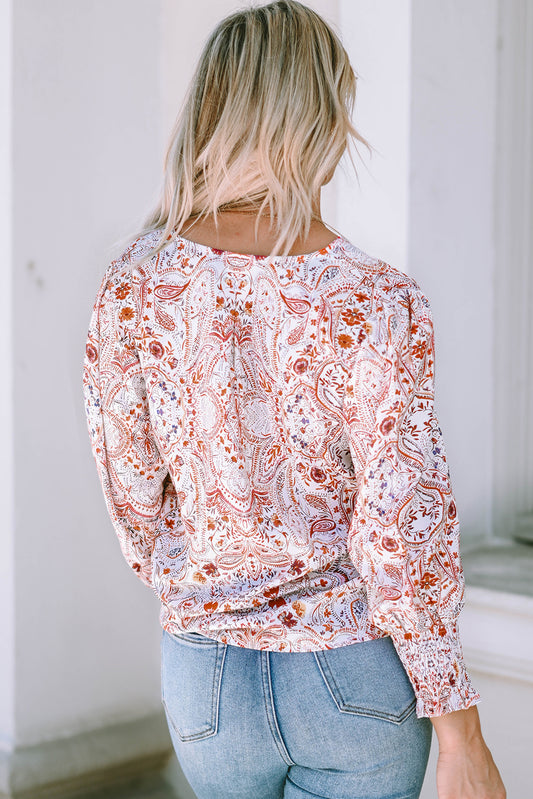 Fiery Red Vintage Boho Print Shirred Cuffs Blouse
