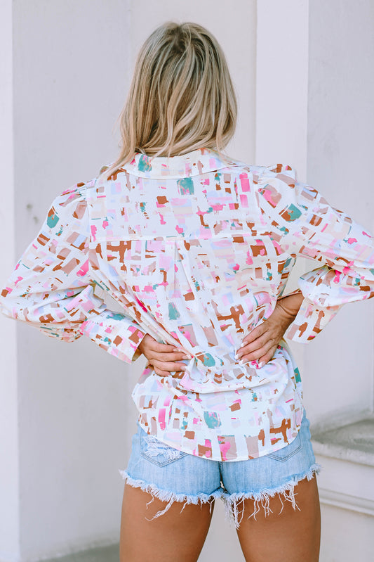 Multicolor Abstract Print Lantern Sleeve Casual Shirt