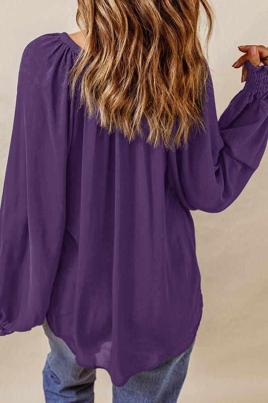 Purple Pleated V Neck Puffy Sleeve Blouse