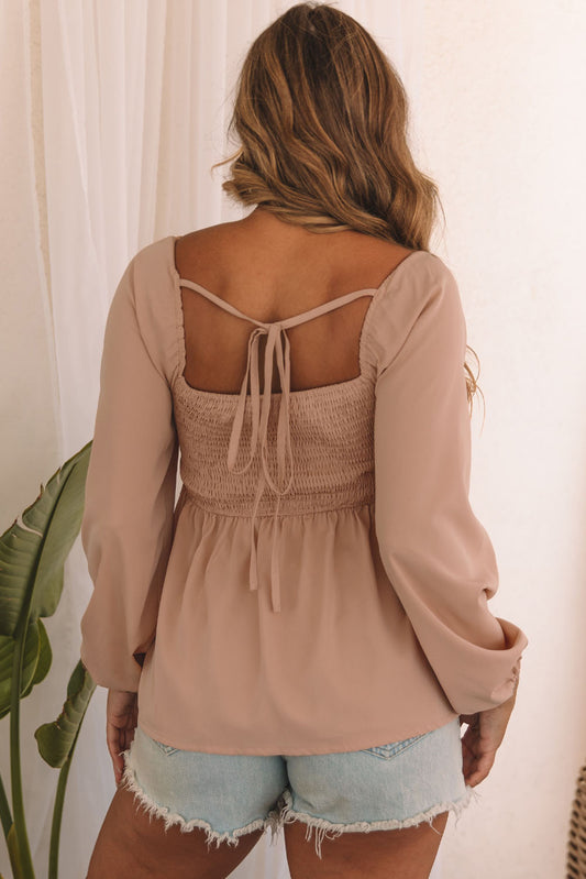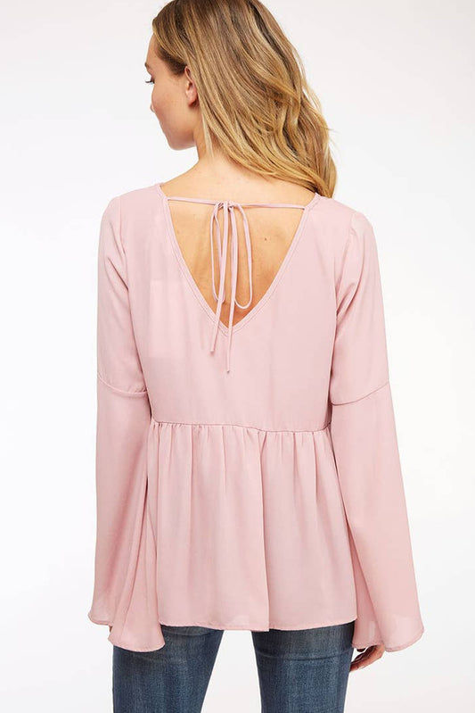 Pink V-Neck Bell Sleeve Back-Tie Ruffled Blouse