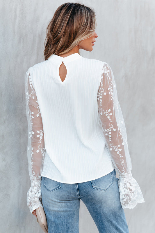 White Contrast Lace Sleeve Mock Neck Textured Blouse