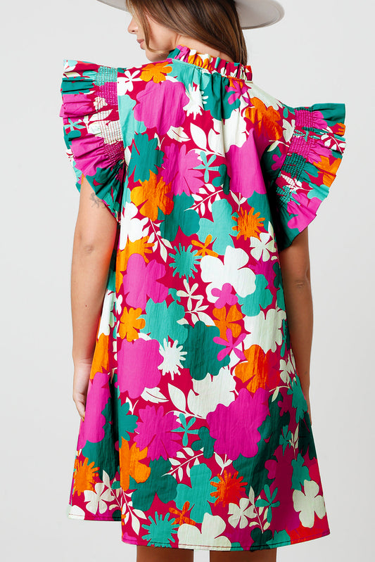 Multicolour Floral Tie Split Neck Flutter Sleeve Mini Dress