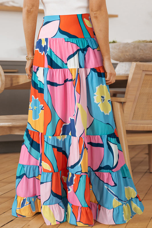 Green Abstract Printed High Waist Tiered Maxi Skirt