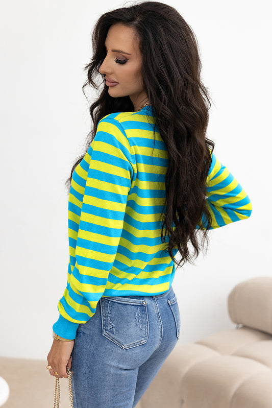 Green Stripe Crew Neck Drop Shoulder Casual Sweater