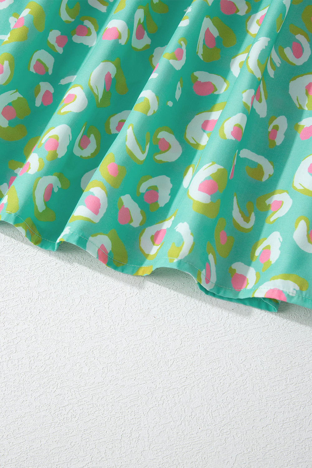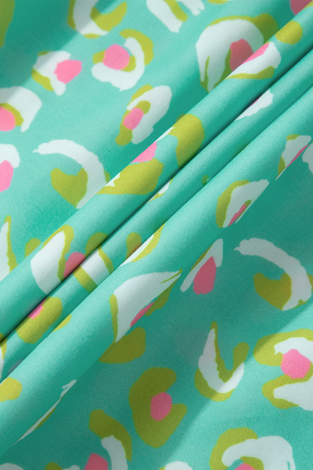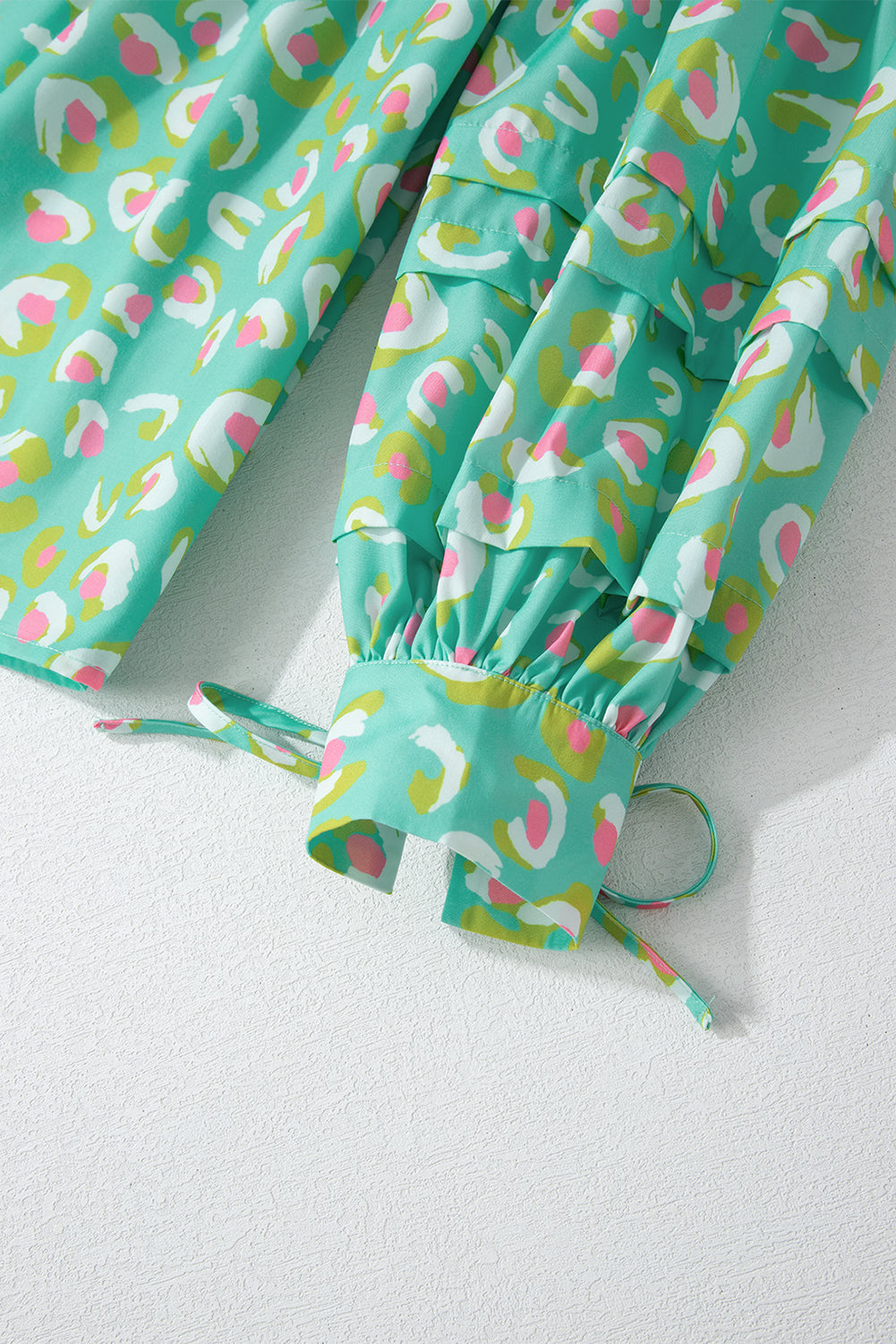 Green Abstract Printed Lace-up Lantern Sleeve Babydoll Blouse